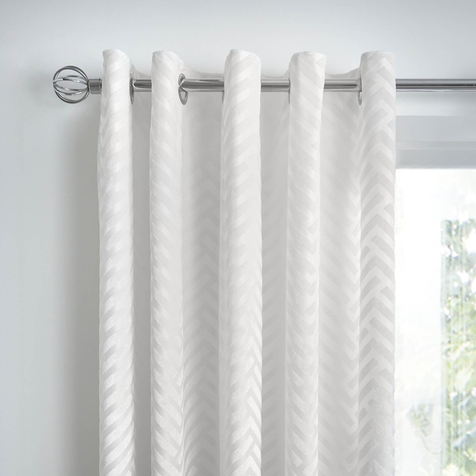 An Art Deco devor� pair of off-white eyelet curtains with a geometric herringbone pattern. Fully lined and ready to hang.
