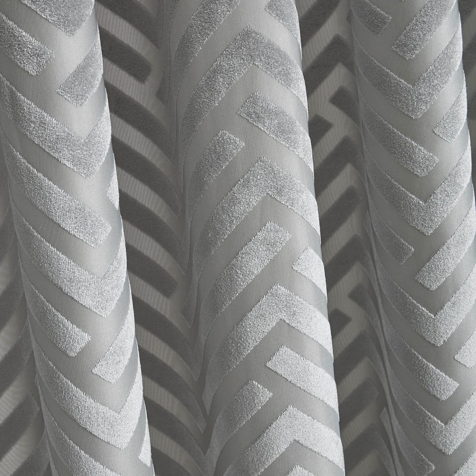 An Art Deco devor� pair of silver eyelet curtains with a geometric herringbone pattern. Fully lined and ready to hang.