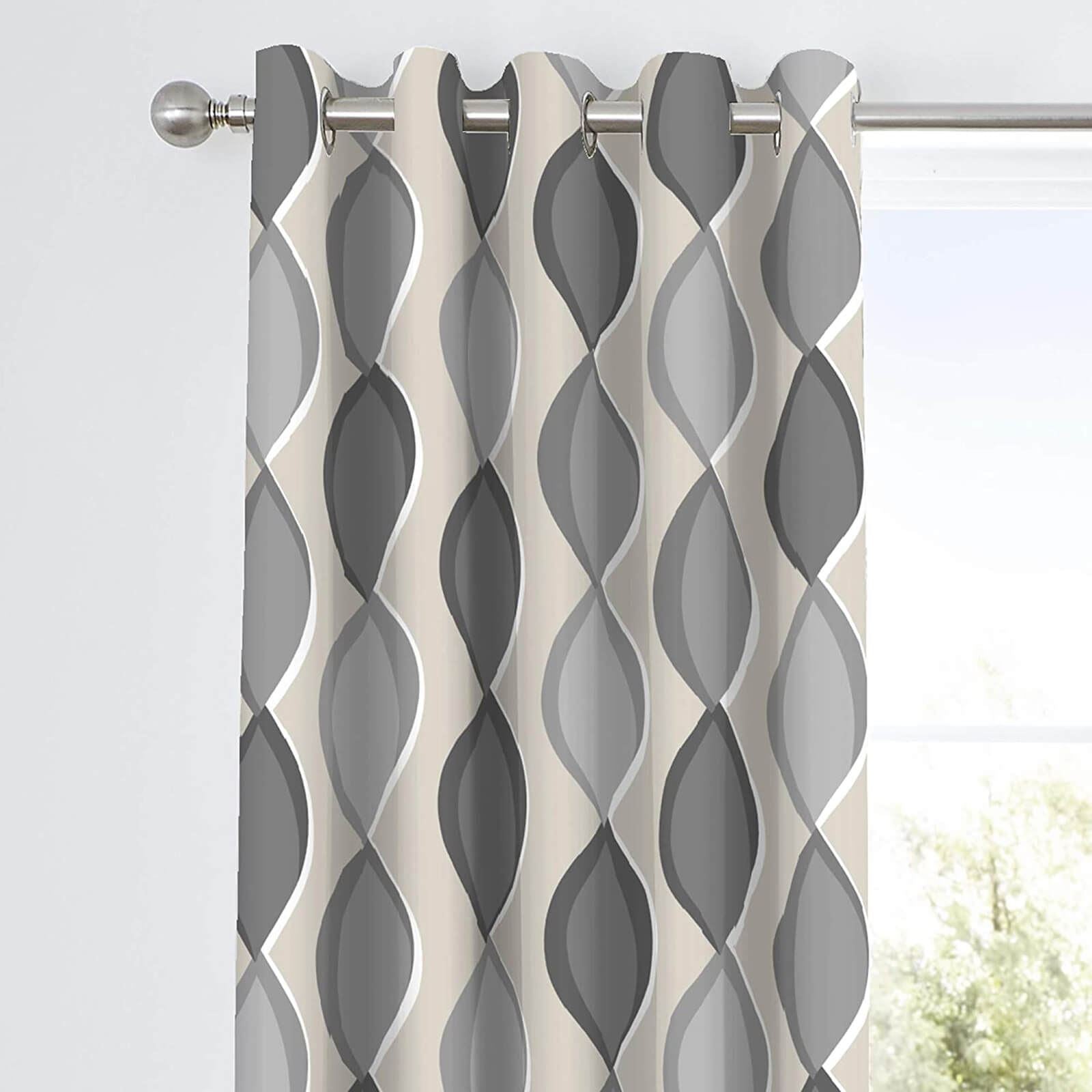 A modern vertical ogee pattern with neutral shades of grey for an eye-catching curtain design. Made with 100% cotton and are lined with easy to hang eyelet header.